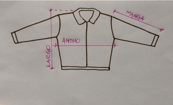 Talle S= 66cm de ancho x 59cm de largo x 50cm de largo de manga